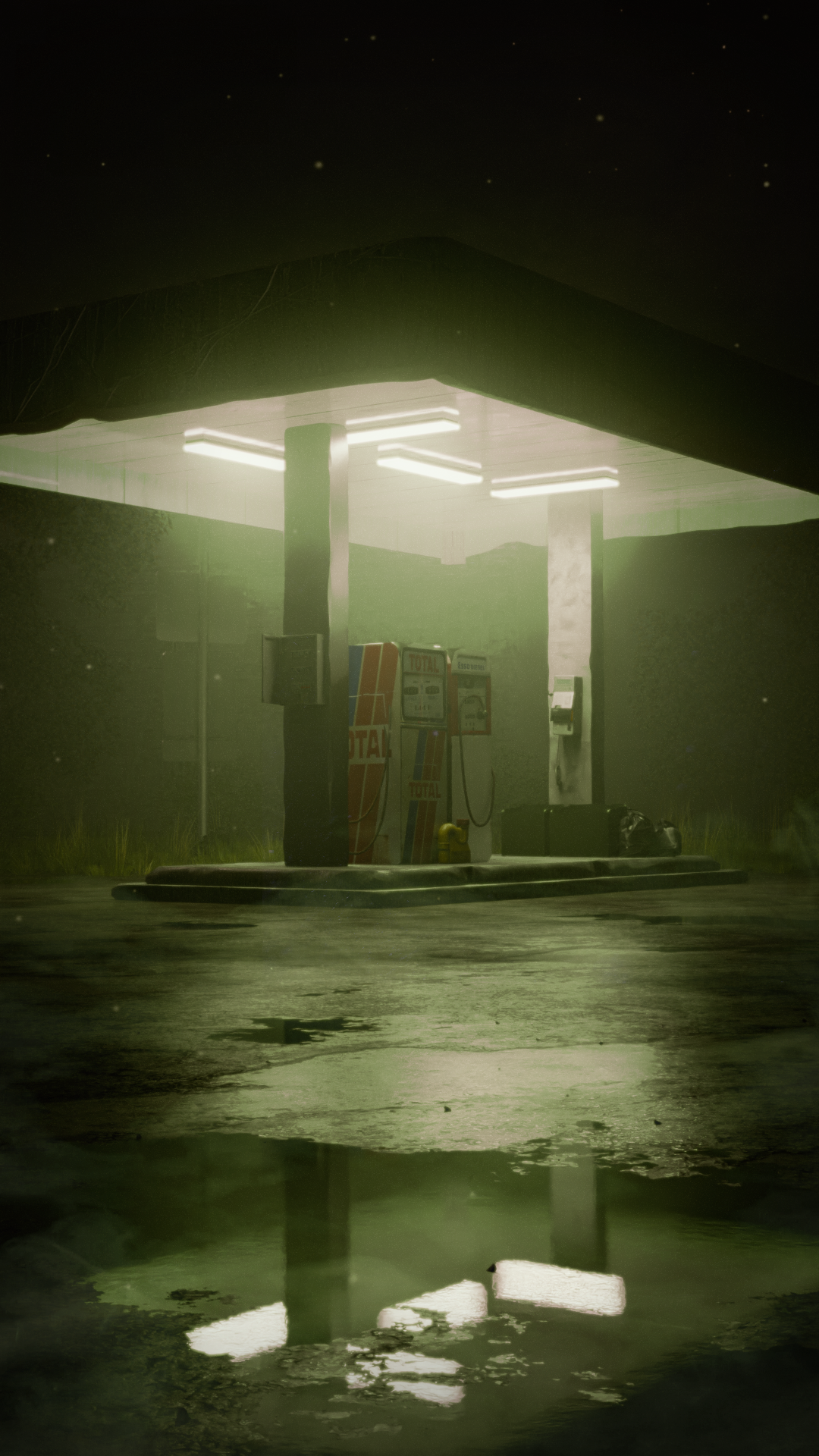 A moody render of a desolate petrol station made with Blender